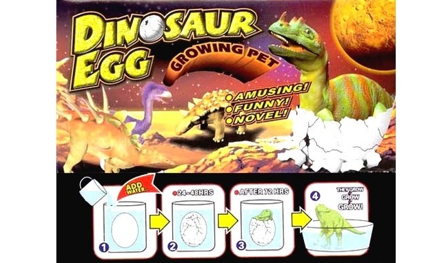 Dinosaurie vajce je hračka pre deti od 3 rokov. Je zložená z priesvitného obalu v tvare vajíčka. Po naliatí vody sa dinosaurie vajíčko vo vnútri do 48 hodín rozpustí a objaví sa hračka - Dinosaurus, ktorá o ďalších 48 hodín narastie o 200 percent.